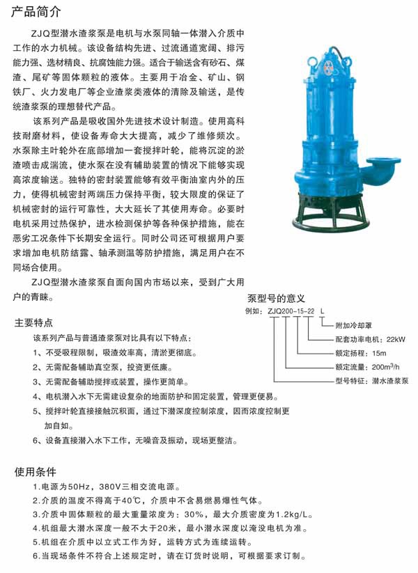 ZJQ型渣(zhā)漿泵是(shì)電機(jī)與水泵(bèng)同軸一體潛入(rù)介質中工作的水利機械。該設備結構先進、過(guò)流通道寬闊、排汙能力強;選材精良、抗腐蝕能力強。適(shì)合於(yú)輸送含有砂石、煤渣(zhā)、尾礦等固體顆(kē)粒的液(yè)體。主要用於冶金、礦山、火力發(fā)電廠等企業渣漿(jiāng)類液體的清除及輸(shū)送,是傳統渣漿泵(bèng)的理想替代產品(pǐn)。